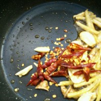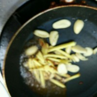 锅里剩下的油,就不再加了。倒入姜蒜,炒香