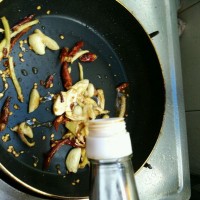 干辣椒容易糊,所以后放。炒出香味,会非常冲人,大家把排气扇开到最大吧。