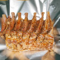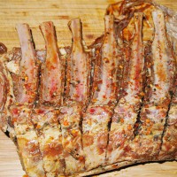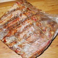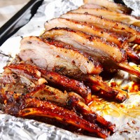 法式切割的内蒙古羊排,没有大骨头,只有一根根的长骨头。洗净后用刀在内侧沿每根骨头划开,不要切断,外侧看仍是一个整块,就酱。先用少量白酒均匀地抹一遍,再用少量盐码一遍,这样做是为了加速羊排入味,减少腌制时间,盐一点点就够了,不要多!