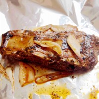 放入预热好的烤箱中层烤1个小时;打开锡箔,再刷层酱汁,温度调至200度,将肉厚的一面朝上再烤15分钟取出;