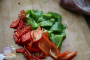 青红椒切成菱形块,菠萝切块(罐头捞出,控干)。