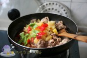 倒入炸好的肉块,青红椒、菠萝块。 均匀裹上酱汁即可出锅。