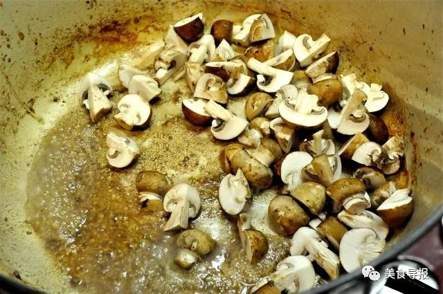 同时,洗净蘑菇并切片,在黄油中煎炒,直至蘑菇变软。牛肉炖好前1小时加入炖锅;