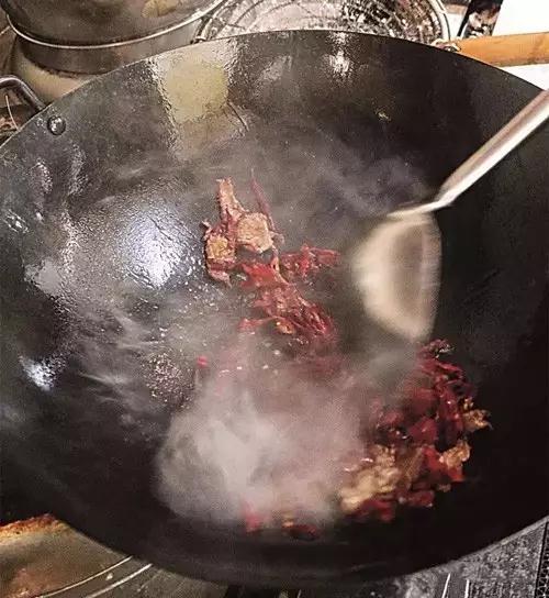 4、锅放底油,煸香羊肉和肉辣皮子。