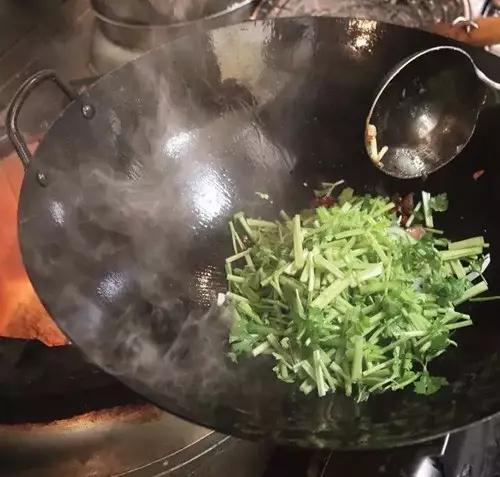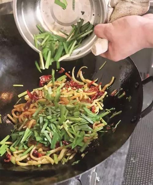 6、倒入拉条子煸匀,撒韭菜段出锅。