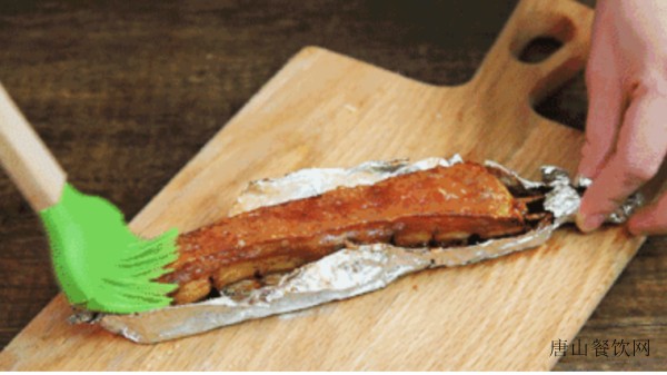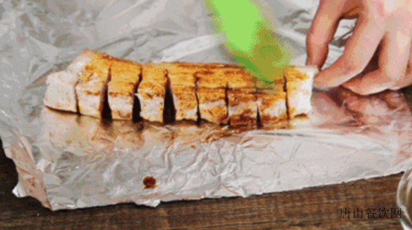 将猪肉焯水后,用刀切成一道一道的刀口,这样的猪肉更能入味,也有助于在烤的过程中保持“姿势”。