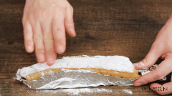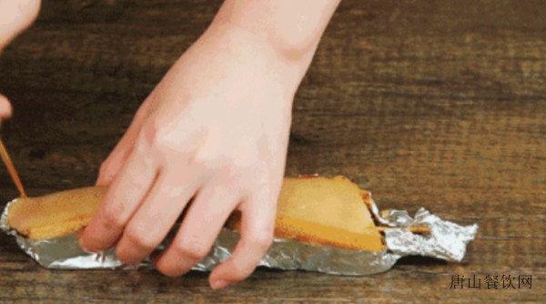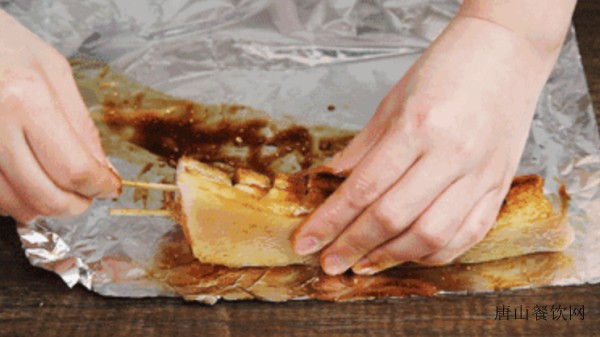 锡箔纸将腌好并用竹签定型好的猪肉三面裹好(除了猪皮那一面不包裹哦),然后用竹签均匀的在猪皮上扎一些小孔出来,扎得越多,皮就会在烤的过程中越酥。