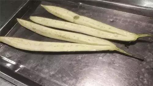 1、长茄(重约500克)纵向剖成两半,每半再一分为二,注意不要切断,保持根部相连,入蒸箱蒸3分钟至熟,取出晾凉。