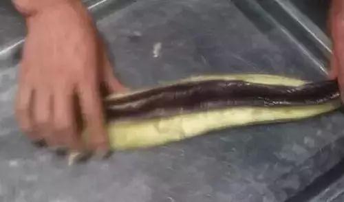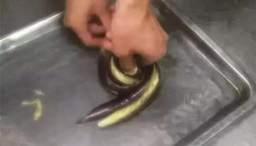 2、盘绕时使两半茄子的瓤朝外,表皮相贴,这样更加美观。