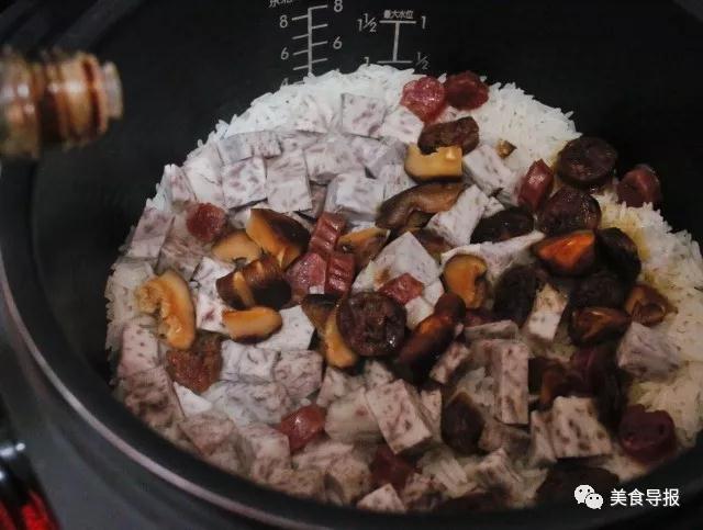 芋头去皮切片后再切小块;腊肠切成片或丁;干香菇泡发回软后,切丁。将米淘好放入煮饭锅里,加入正常煮饭时的水量,按下煮饭键将米饭煮熟;
