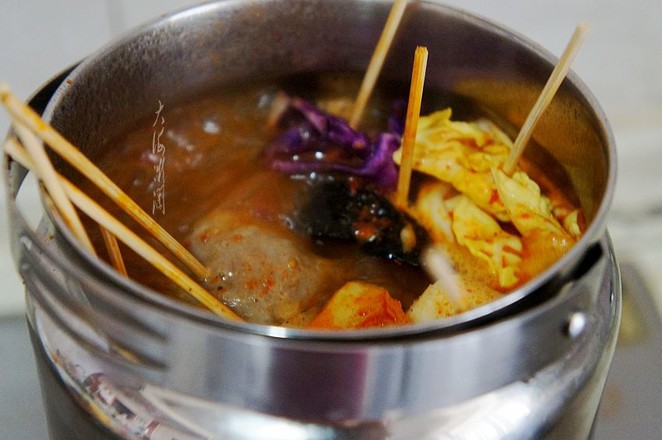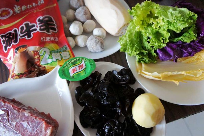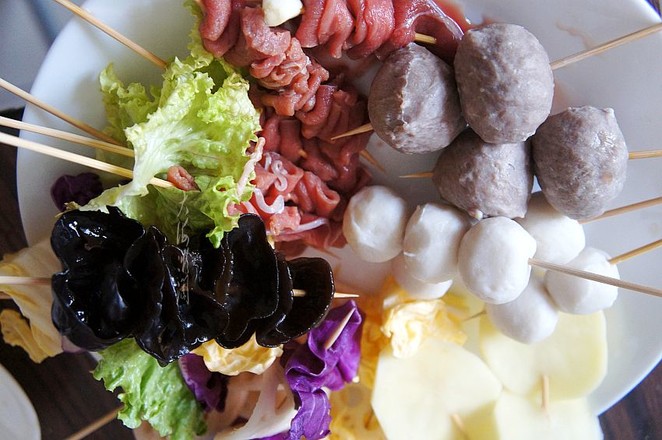 黑木耳泡发后摘洗干净穿签,腌制好的牛肉片穿签(最好有鱼腥草,用牛肉卷起来更美味,北方这个季节买不到),土豆、藕切薄片穿签。鱼丸、牛丸解冻后穿签,所有蔬菜洗净切片随自己喜欢搭配穿签