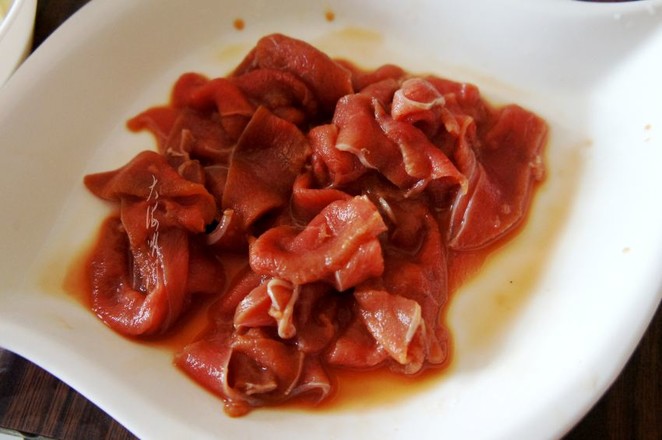 将牛肉切薄片加入适量的淀粉,料酒、味极鲜酱油拌匀腌制半小时