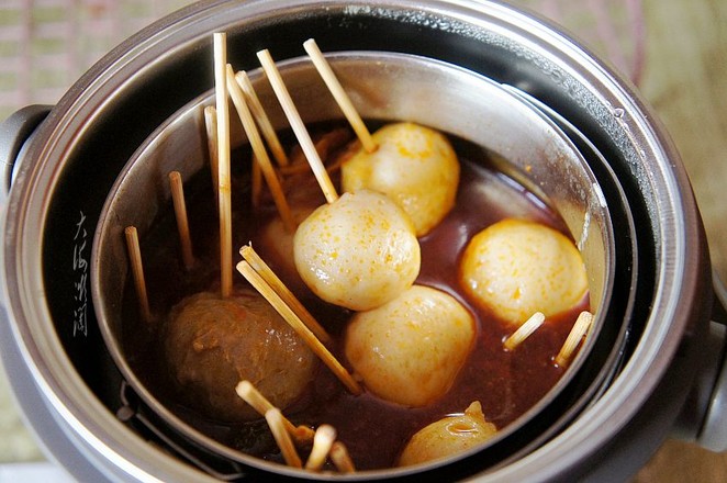先下入耐煮的配菜鱼丸、牛丸、藕片、木耳煮2-3分钟