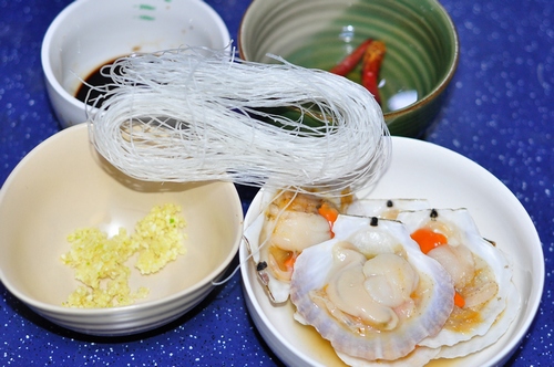 将有到的食材准备好。将扇贝洗净,粉丝用凉水泡软后再用开水烫一下。