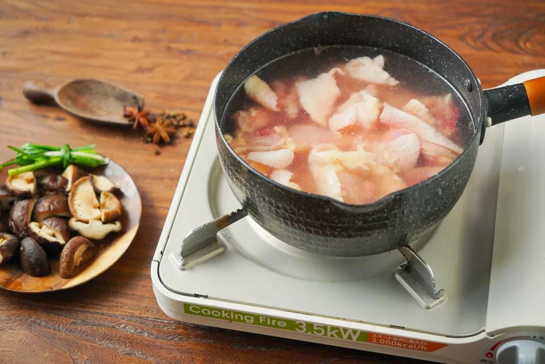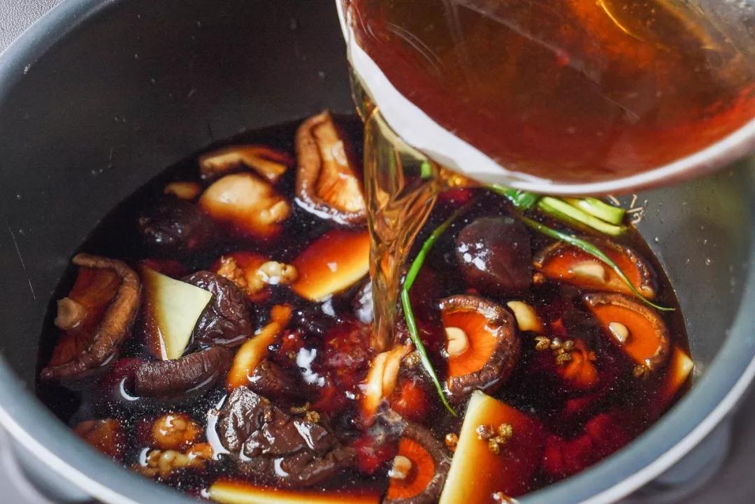 2、鸡腿块和泡好的干香菇放入电饭煲中,倒入香菇水没过鸡腿块,加2颗八角、10粒花椒、5片姜和葱结,再倒入1勺料酒、2勺生抽、1勺老抽和少许冰糖,关盖按下煮饭键。