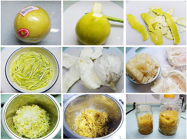 材料:蜜柚1个 连皮整个1KG、用了4/5的果肉,全部的皮,冰糖200克、蜂蜜一瓶。