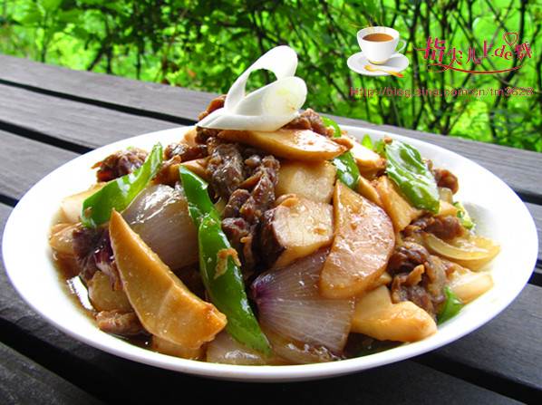 再用底油先将洋葱爆香, 再和杏鲍菇一起煸炒, 当杏鲍菇变软后加入过油的牛肉和青椒;