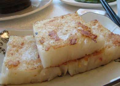 3. 萝卜去皮,切成细丝后放入炒过腊味的锅中略煸一下,加入清水,调入精盐、白糖大火熬煮,期间将粘米粉和栗粉拌匀,用水调开后拌入萝卜汁水中,待萝卜变成透明色,关火