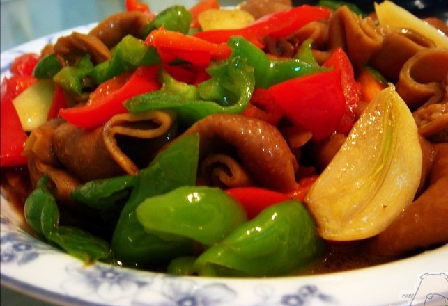 3. 起油锅,将蒜片、老姜、花椒下锅爆香,放入切好的肥肠爆炒,炒香后加黄豆、花生,紧接着放洋葱、青椒、豆豉、味精、鸡精,炒匀装盘即可。