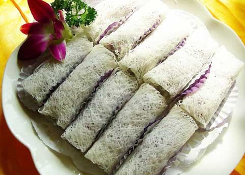 1. 将鲜山药洗净,上笼蒸熟后取出去皮,切成3厘米长的段,再一剖两片,用刀拍扁。