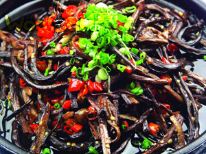 4. 锅内放入色拉油30克,烧至五成热时放入姜丝小火煸香,下小米辣10克、茶树菇、蚝油、鳝丝小火翻炒1分钟,用鸡精、盐3克调味,淋红油出锅,装入铁板内,撒小米辣5克、葱花上桌。