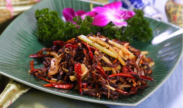 “干煸鳝丝”是川菜的独特风味名品,是将鳝鱼丝入锅在中火上,用微量菜油反复煸炒,使之油酥返软。把酥与软巧妙地融合于一体,“酥中有软,软中带酥”,正是此菜火功上的独到技艺。此菜干香但不焦糊,酥软又不枯硬;鳝丝伸条不变形,麻咸鲜香浓,是宴席上的佐酒佳肴。
