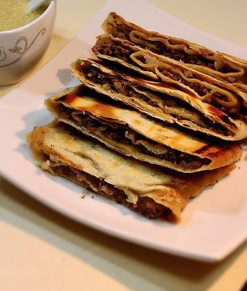 10.把两面涂抹好油后继续烙至金黄便可出锅,出锅后用刀把肉饼切开码盘便可上桌食用,在食用时可配以小米粥同上,一款香喷喷的千层肉饼便做好了。