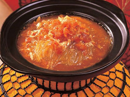 11. 下素鱼翅、素蟹黄、盐、味精、胡椒、糖共烧;