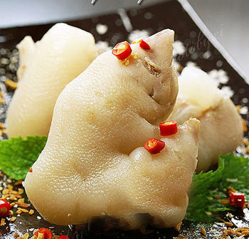 白云猪手做起来相当麻烦,首先要小心地将猪手切开,取出中间的那根大骨头,放到葱姜水中煮熟,再用线绳和竹片固定,回恢成猪手原来的样子,然后放到调味汁中浸足时间上味,直浸泡到猪手呈现洁白晶莹的质感,如白云一般,吃起来只有甜美原味,不允许有任何异味。白云猪手的做法,不弱于一场严谨的科学试验,必须要耐心地用镊子拔除所有细猪毛,懒惰的厨师通常用火枪烤猪毛,却不知就是火枪喷出的火苗,会令猪皮收缩,不仅影响了外观的肥满,最基本的弹牙口感也会消失殆尽,所以,白云猪手绝对是考验岭南煮妇的一道大菜,无论食材选择、手工技巧,还是火候控制、时间上味,都非常讲究。