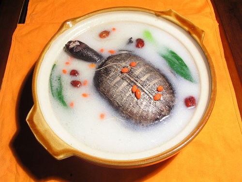 2:放入水温大概有70~80度,将宰杀后的甲鱼放在热水中,烫2~5分钟(具体时间和温度根据甲鱼的老嫩和季节掌握)捞出之后用手戳去表面的白膜,这样做出来的甲鱼就没有腥味