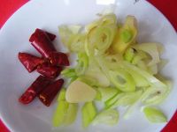 4、葱姜蒜切成片,干辣椒切成小节,