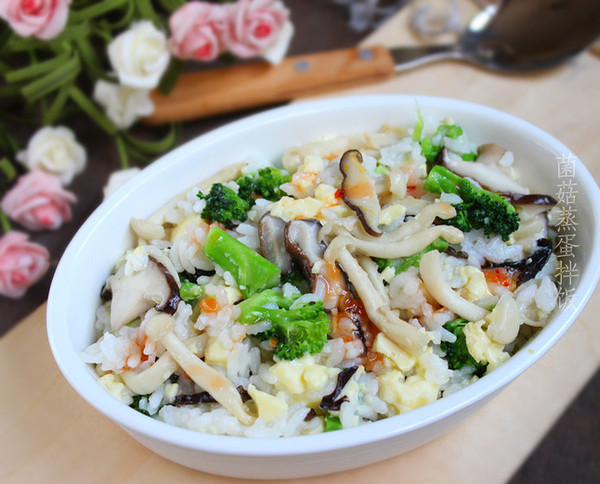 米饭炒好后,出锅前把蛋羹倒入其中轻轻翻匀盛入盘中,表面淋蕃茄酱即可