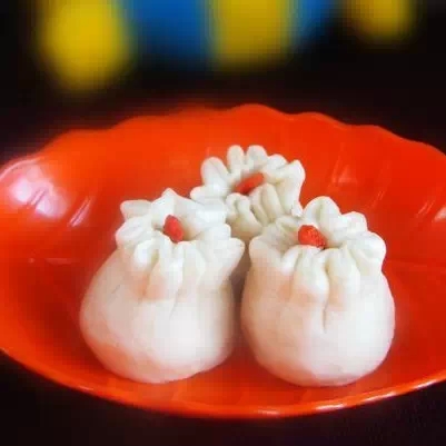 5)将圆片四周捏在一起做成生坯;在生坯上点缀枸杞,醒20分钟,蒸15分钟即可。