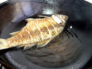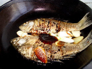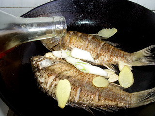 2、铁锅上炉,先将锅烧热,再倒入适量花生油,油热后,将一条鲫鱼放入,两面煎黄后,取出放盘,再将另一放入煎好放盘备用。