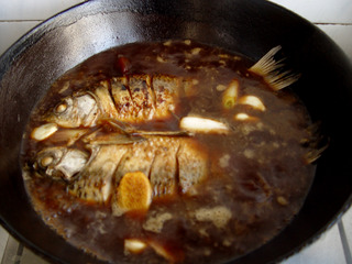 6、倒入大半瓶啤酒(我用的泰山啤酒),一定要没过鱼身表面。