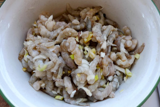 1、将虾仁解冻,挑去虾线,洗净,加1勺料酒、1小茶匙生粉、半个蛋清、少许盐、一半量的葱姜蒜碎,抓匀,腌制半天以上。