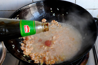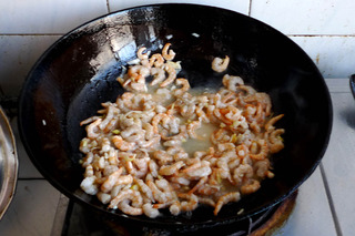 2、热锅上油,将腌好的虾仁倒入,大火翻炒。