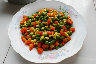 7、将五彩蔬菜丁解冻,放入盘中备用。
