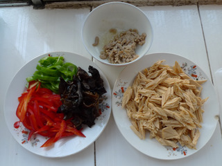 1、腐竹冷水泡发,切小斜段;木耳温水泡发,洗净,撒小朵;青椒洗净,切条状;红椒洗净,切条状。