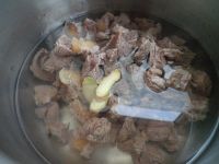 3.锅中放水,放入姜片,料酒,牛肉煮到8成熟