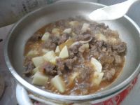 牛肉含蛋白质、脂肪、维生素 B1、维生素 B2 、钙、磷、铁等成分。土豆含大量淀粉、蛋白质和胶质柠檬酸、乳酸及钾盐。牛肉味甘性平,能补脾胃,益气血,强筋骨,止消渴,民间有“牛肉补气,与黄芪同功”之说。虽然有牛肉不能与土豆一起吃的说法,但是偶尔吃吃,也无所谓了。