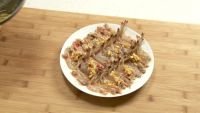 1.大明虾去须,然后剖开,将虾尾摆入盘中,蒜子、青椒、红椒依次切碎。