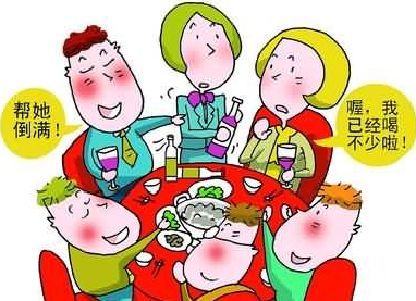 人们在饮酒、尤其是大量饮酒时,常常会产生饱胀感,所以喝完酒后就不想再吃饭了,其实这是非常有害的。科学研究发现,在喝酒的同时多吃饭,补充足量的碳水化合物,可以减少乙醇性脂肪肝的 发生。在正常情况下,饮入的酒经过胃肠道吸收后,在肝脏中经乙醇脱氢酶的作用转变为乙醛,而后生成乙酸,最后分解成二氧化碳和水排除体外。在大量饮酒时, 体内的乙醛来不及转化为乙酸,会生成大量的超氧阳离子自由基,导致人体内氧化和抗氧化平衡的失调。此时如果还能够多吃蔬菜和水果,补充维生素C、维生素E、微量元素哂等重要的抗氧化剂,可减少酒精对人体的伤害。