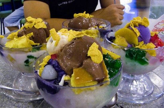 哈啰哈啰(Halo-Halo) 哈啰哈啰是一种特色冰激凌。在它的发源地菲律宾,这不仅仅是一时的流行,而是一种经典的夏季美食。这种冰激凌看起来像一种颜色鲜艳的冰激凌圣代,里面含有甜酱豆、椰肉、甘薯、布丁、榴莲、芭蕉、冰、牛奶和冰激凌。在菲律宾的餐厅和一些冰激凌店或者奶茶店,都有哈啰哈啰出售。"