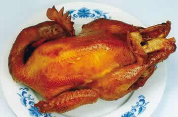 工艺:将宰杀的活鸡,去血、去毛、去内脏,再用水洗干净后搁置沥干水,然后将鸡的形状稍做整理,按照大小依次放入锅内,并加入适当的花椒、桂皮等调料,用特制的汤煮,卤煮时要求汤要漫过鸡身,先用大火烧至沸腾,再用小火慢慢炖至鸡肉熟烂。接下来将煮熟的鸡放入事先烘热的熏锅里,并加入适量白糖进行熏制,待熏制好了以后,涂上一定的香油到熏鸡上,即可食用。