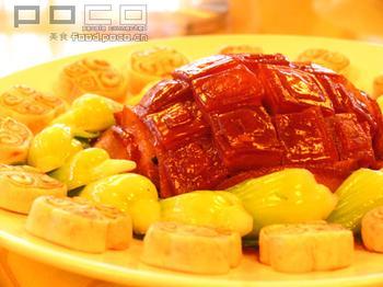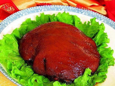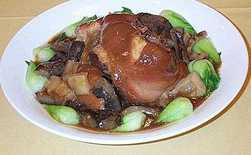 2.海参用沸水焯出,加葱、油,高汤、酱油、味精等烧入味。 肘子反扣大盘中央,将海参围摆一周,用原汤调味,调色,水淀粉勾浓芡,淋明油浇在海参和肘子上即成。