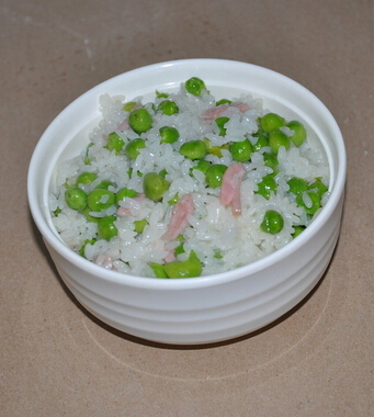 米饭快煮好时加入洗净的豌豆,搅匀后继续烹煮。煮好后在加入洋葱丝、熟的瘦肉粒,盖上盖再焖一会儿即可。这时大米中谷类蛋白、豌豆中得豆类蛋白和瘦肉中的动物蛋白互补,营养全面,适合白领和学生人群吃。