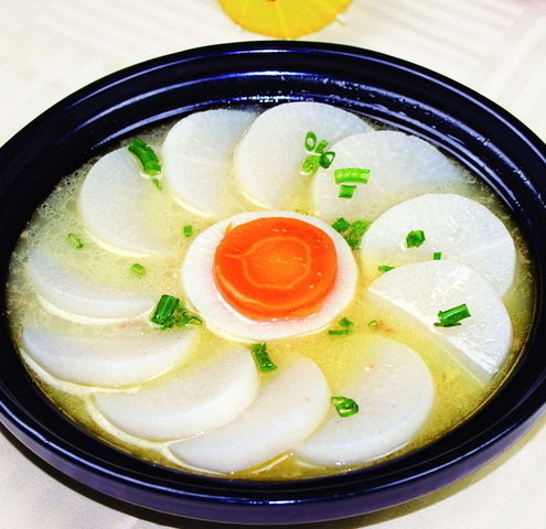 白萝卜和鲫鱼煮汤有温中下气、健脾利湿的功效。这道汤还妙在“二白”食材上,白萝卜浸在奶白色的鱼汤里,让人看着就很有食欲。